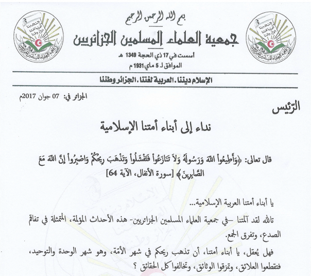 تالله لقد آلمتنا –في جمعية العلماء المسلمين الجزائريين- هذه الأحداث المؤلمة، المتمثلة في تفاقم الصدع، وتفرق الجمع.